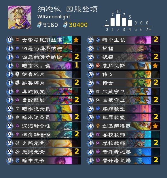 奇迹牧成为了科技德走强之后最大的输家,已经逐渐退出主流卡组之列。目前最为主流的牧师卡组是一度被认为是“奇迹牧下位替代”的纳迦牧。与奇迹牧相比,纳迦牧确实存在着更加依赖牌序的问题,但是其攻势的绵延性以及其实还算不错的爆发能力都更加适合这个环境。在构筑上,纳迦牧的27张卡都已经确定,最后的三张牌一般是在纳鲁碎片、暗言术:噬和纳亚克·海克森之间选择,而其中最常见的两种构筑是双碎片单噬和双噬单碎片。在我看来,纳鲁碎片的可交易属性对于纳迦牧这么一套比较依赖牌序的卡组比较重要,个人也更推荐双碎片单噬的构筑。