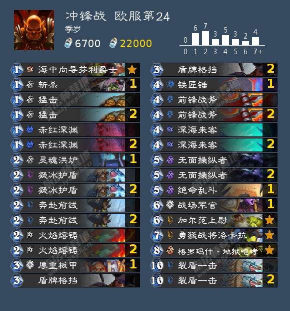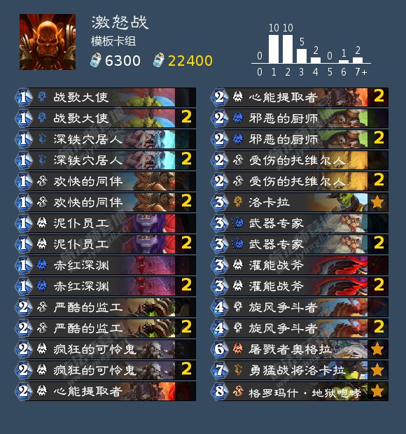 激怒战是这个环境中较为不错的进攻卡组,在手风较顺的情况下很容易在五六费就赢下对局。从构筑上来说,我认为苦痛侍僧的抽牌有点太慢了,个人还是更建议携带邪恶的厨师。此外,由于现在环境中的主流的卡组要么是40血(大奖贼、超凡德)、要么控场能力优秀(火冲法)、要么理论终结回合在激怒战之前(快攻德、纳迦牧、奇迹贼),我认为现在的激怒战也需要携带吼爹作为最后的终结。