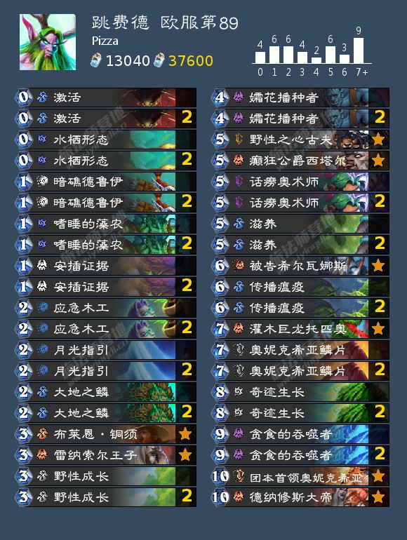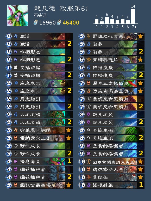 传播瘟 疫为德鲁伊提供了很不错的反铺场能力,而终极感染则是不可多得的补牌利器。在这两张牌的作用之下,上限更高、启动更快的超凡德取代了跳费德,成为了现在德鲁伊最热门的形态。在具体构筑上,目前常见的超凡德的常见分歧有两个:一是带什么解牌、带多少;二是在大抽牌上的选择。在解牌选择上,携带一张话痨奥术师基本可以算是共识,此外可供选择的单卡还有掩息海星(针对奇迹贼、奇迹牧和纳迦牧)、第二个话痨奥术师(针对快攻德、小鬼诅咒术等铺场快攻)、闪金镇豺狼人(可以帮助卸牌,也可以补强超凡回合的防守能力);常见的大抽牌带法可以分为四类:单终极感染、单蓝龙、双终极感染、单终极感染加单蓝龙。单补牌和双补牌之间的选择主要看对自己自不自信:因为基本当且仅当超凡带安娜时,超凡德才需要两个补牌(而且这个大抽牌的卡位需要通过不带第二个解牌省出来)。具体如何选择还是要看个人的牌风。