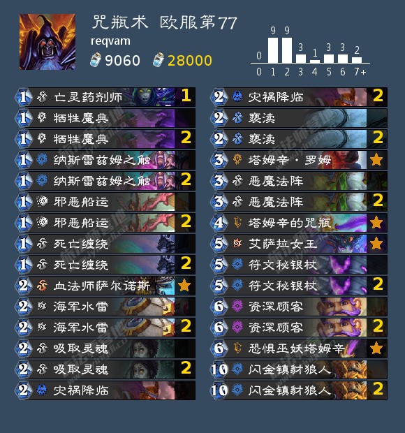 现在最为主流的术士卡组其实是同时好打大奖贼和超凡德的咒瓶术。从构筑上来说,我认为现在的咒瓶术理应携带艾萨拉女王,因为除了克制现在抬血能力十分恐怖的德鲁伊,它更大的作用其实是使得咒瓶术在罗姆被破坏之后保有打出56点斩杀的能力。