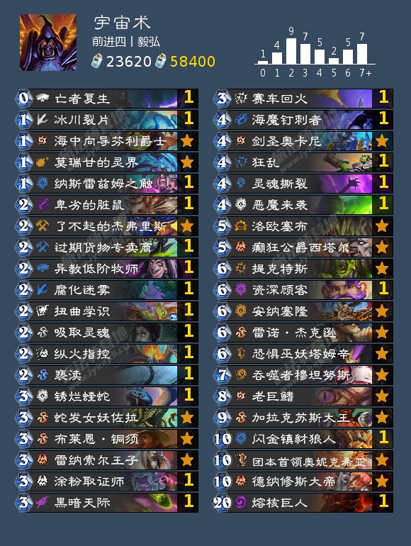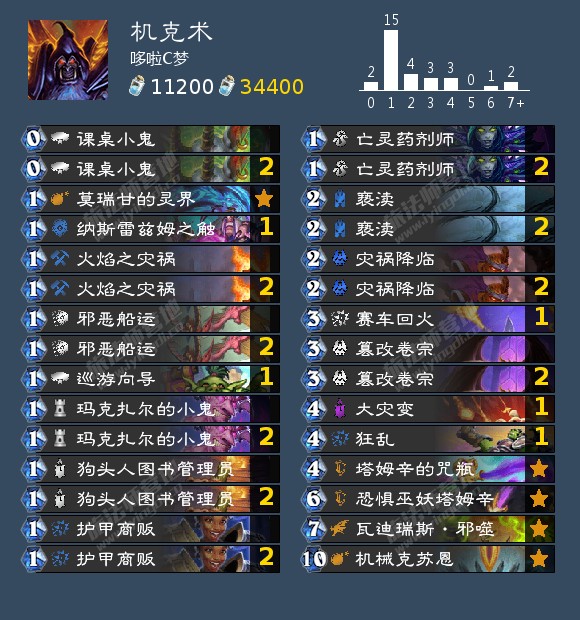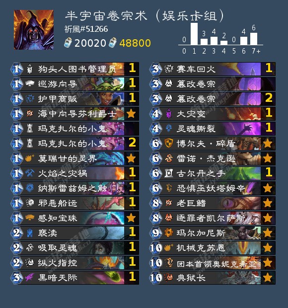 投稿人说扭曲学识非常好用,简直是个小姐夫,有时候2费开学识能发现赛车回火,发现亡者复生配合安纳塞隆豺狼人打节奏,还能发现aoe对抗快攻,甚至发现老巨鳍这样的神卡。