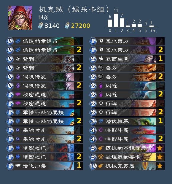 关键来了,这套卡组的留牌比较讲究,据我的经验,迈拉作为核中核,起手是必留的;黑刀必留,让我们1费不会空过。这套牌只有3个随从,所以起手留行骗和潜伏帷幕,但如果随从上手了,迈拉没上手,我一般会把随从换掉去找迈拉和帷幕,因为没有迈拉,你就算3张随从齐了也斩不掉。