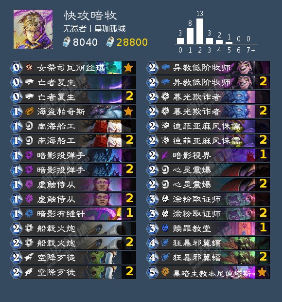 来自孤城的快攻暗牧,它使用这套卡组从前百开外打到了35名左右,胜率约65%。