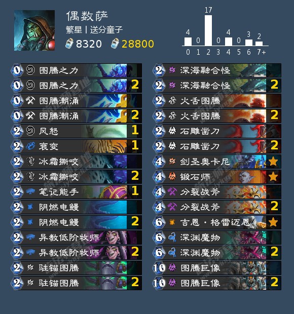 来自繁星丨送分童子的偶数萨,他使用这套卡组在昨天(14号)登顶。