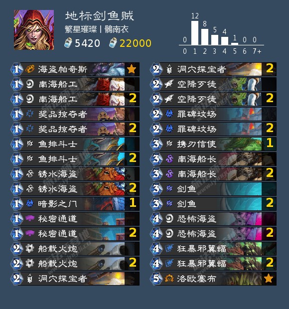 来自繁星璀璨丨鶻南衣的地标剑鱼贼,他使用这套卡组以48场胜率54%打到第68名。