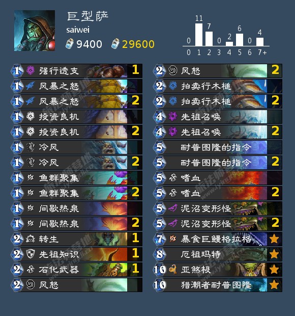 来自saiwei的一套巨型(大哥)萨,他使用这套卡组以21场90%胜率打上了传说但排名不高应该是10倍星。