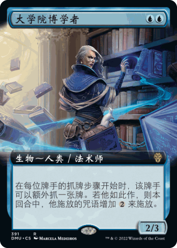 这样一来,博学者就能变成非常廉价的抓牌引擎,也让我们在使用廉价干扰时更有底气。这也就是为什么我甚至用上了罗娜的涡旋,这张牌的两种模式非常吸引我。前期没费的时候它类似渐失希望,虽然亏牌,但可以靠博学者弥补。后期四费解一个生物或旅法在探险中仍算是尚可接受。主回合做事的套牌如果不能在前三回合建立起又铺又大的场面(比如妖精或者天使那种),则很难和这套牌的海量去除、反击抗衡。最后,博学者的身材也足够好,2/3可以白换很多小红生物。