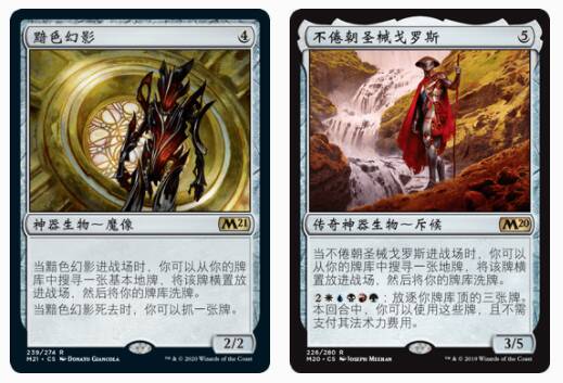 这两位是类似套牌中肯定会出现的生物,之前的史迹无色就使用它们。两个生物的进场效果都是加速,黯色幻影可以填旋抓牌,朝圣械是后期无处宣泄的法术力出口。我参考的原版本中,使用了大量高费大哥,其中包含四张灵龙乌金,却没用黯色幻影。这个配置显然是为了戈罗斯能够呼风唤雨设计的,但实战中很多时候轮不上戈罗斯起动异能。太多大哥只能仰仗于涤地野火计划顺利实行,但往往事与愿违,黯色幻影能起到极佳的润滑功能,因此我带满了四张。