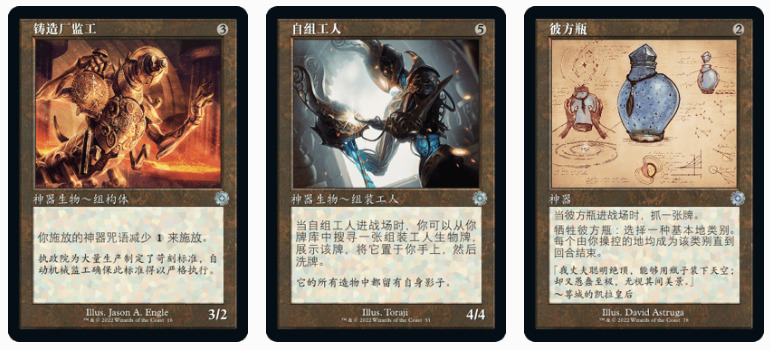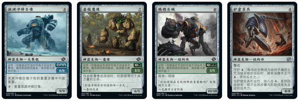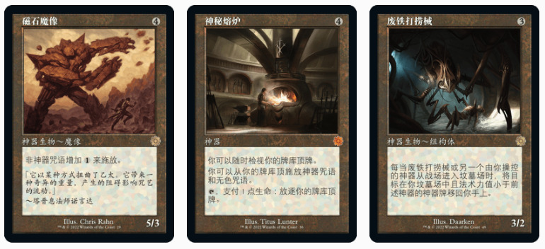 如果你在本系列想很正常的抓个双色套牌,想必在轮抓过程中,包里的一些纯无色神器和那五个对基本地数量有要求的银牌循环一定会让你眼前一黑:大多数无色神器的质量都很低,尤其是无色神器生物,基本都不如有色牌,而那五个银牌则很难在双色套牌里发挥纸面上的上限, 如果你是9/8配地,腐化的期望值是6费打3回3,白去除则要在五六回合才能解掉3费生物,肯定都是非常亏模型的。