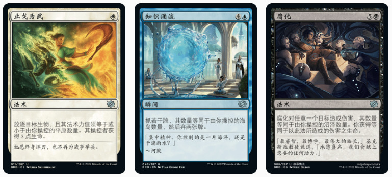 纯色的优势除了不卡色,便是可以最大的发挥关注基本地数量的这几张银牌的作用。除了红绿的那两个和思路不搭,其他几张都很适合当做套牌的关键单卡,尤其是蓝黑的这两个,前者能抓海量的牌,后者则能当翻盘去除甚至是秒人的杀招。