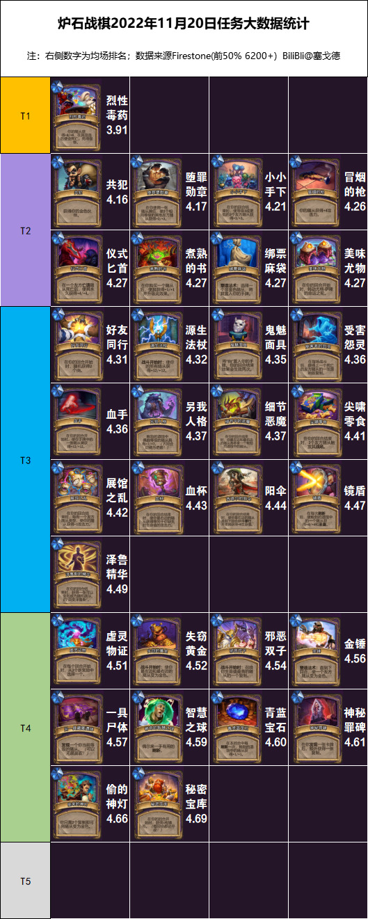 另外大家一直关心的任务排名Hsreplay一直没出,但是Firestone插件(另一款比较热门的插件)里已经有统计了,我整理了一下