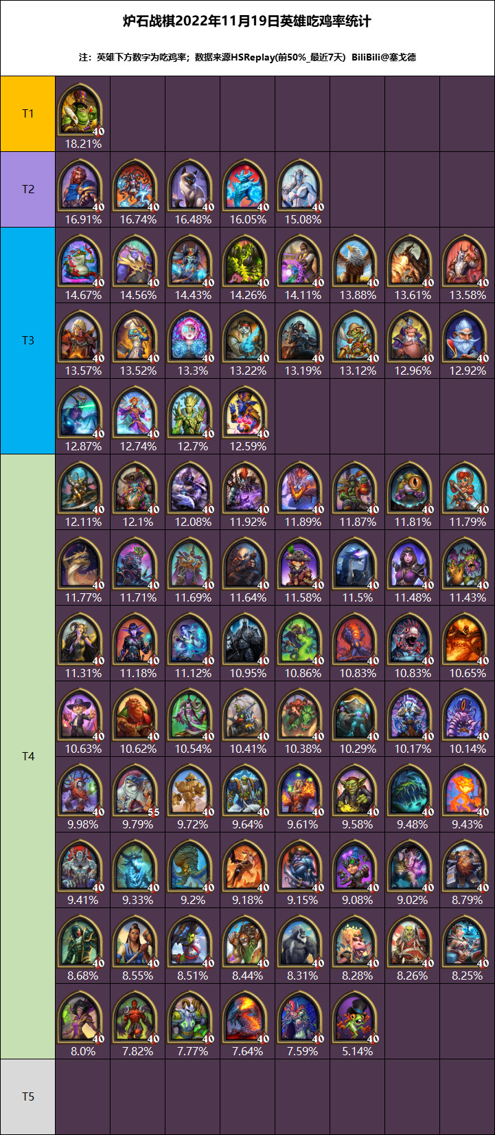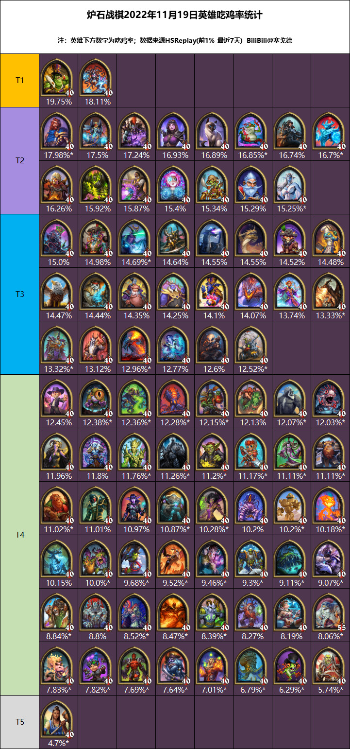 本周中位局前50%玩家(积分6300+,约190万场对局)的英雄均场排名和吃鸡率: