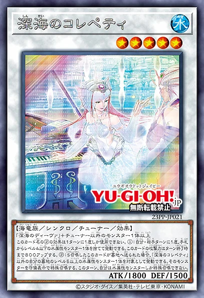 这个卡名的②的效果1回合只能使用1次。①:自己·对方回合1次,从手卡丢弃1只4星以下的水属性怪兽才能发动。这张卡的攻击力直到回合结束时上升800。②:同步召唤的这张卡被送去墓地的场合,以「深海歌后」以外的自己墓地1只5星以上的水属性怪兽为对象才能发动。那只怪兽守备表示特殊召唤。这个回合,自己不是水属性怪兽不能特殊召唤。