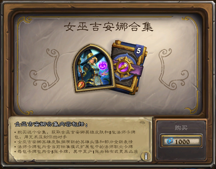 含构筑模式法师新皮肤“女巫吉安娜”和5法师包。国服售价60,外服售价1000符文石。