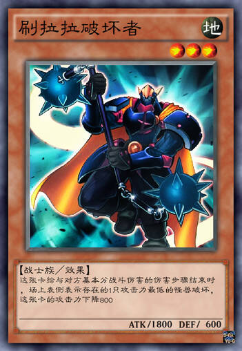 拥有给予伤害后破坏场上一只攻击力最低的怪兽然后下降自己攻击力的效果,与“破坏者”设定相符。