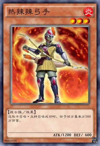 卡图中另外一只怪兽是【热辣辣弓手】。这两只都是动画游戏王ZEXAL的主角九十九游马使用的怪兽。