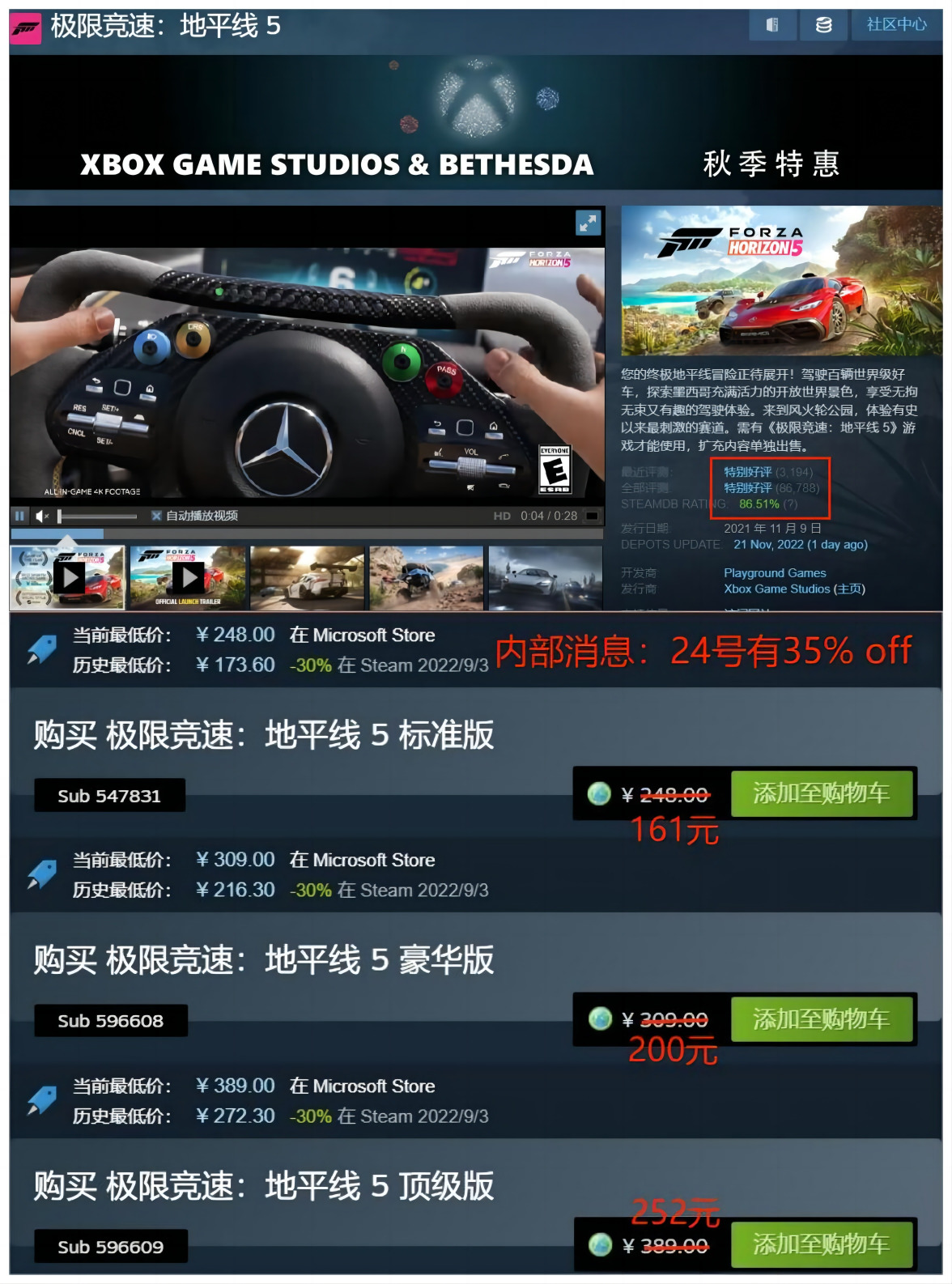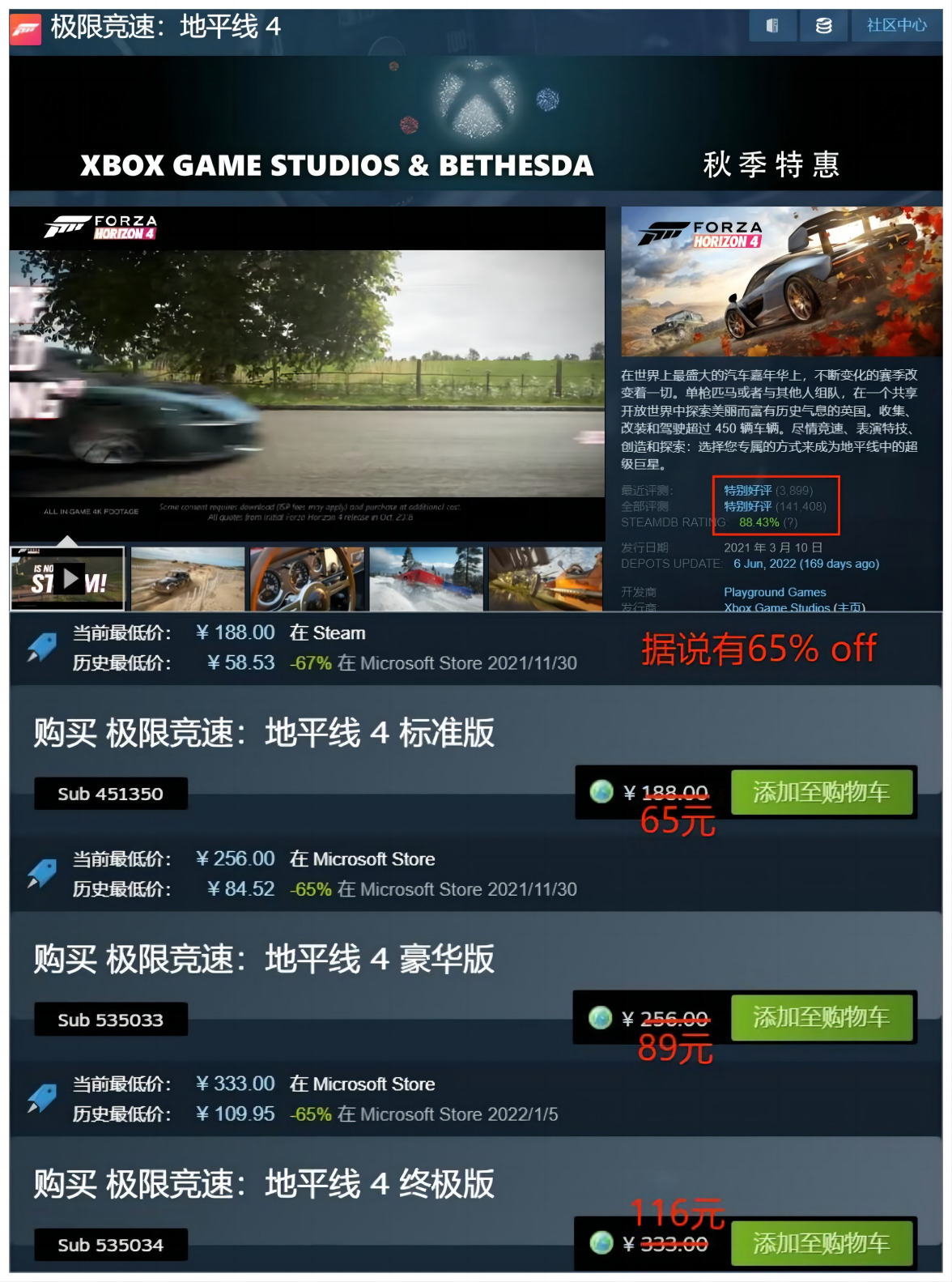 除了今年结束EA的《禁闭求生》,我个人最期待的还是《地平线》系列折扣,因为作为竞速+旅游爱好者,这可能是我目前最方便、安全且便宜的“出境旅游方式”了。去商店界面逛了一圈发现《地平线5》和《地平线4》都在折扣页面,但是却没有显示折扣——我合理怀疑又是Steam致命的时区问题,经过多方打探确实是要等24号才有折扣上线,但!不影响我华丽地加入购物车并滑铲下单!