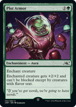 【备注】牌名plot armor直译“情节护甲”,指的是小说里由于剧情需要,某人总是大难不死,读者就会调侃此人有plot armor。风味文字的get word直译“获得单词”,意思是“获得情报或信息”;have words直译“有单词”,意思是“吵一架”。