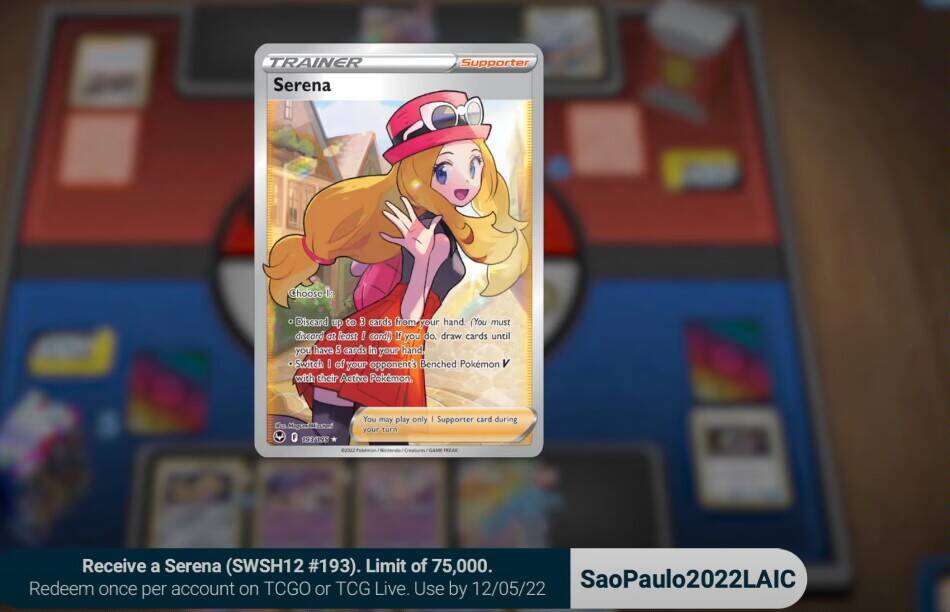在PTCGOL或者PTCG LIVE中输入saopaulo2022laic(不分大小写),即可兑换全图莎莉娜一张,限量75000分,换完为止,OL和live都可以换一次。