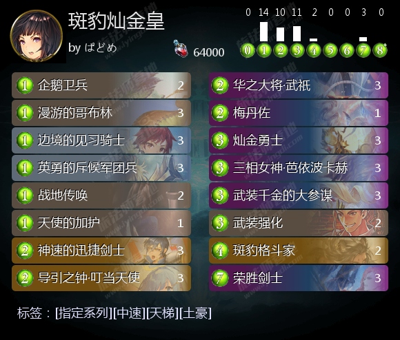 中期尽快堆叠协作数到10,可以为此送掉小随从腾出场地。之后通过战地传唤、武祇、大参谋赚取资源,找机会用神速的迅捷剑士配合武装强化等Buff牌打斩杀。