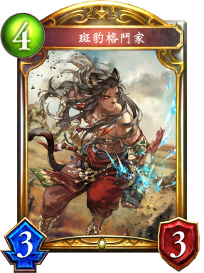 斑豹格斗家能在解场的同时过牌,可以在先手第4回合扩大场面优势,或在中期为疾驰随从开路。斑豹还有机会在导引之钟·叮当天使等守护随从的保护下站场,而一旦对手未能解掉他,距离死亡便不远了。
