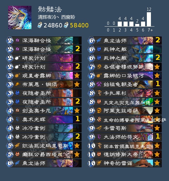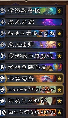 基本是一个龙法的构筑,奥术光辉是用来抽口袋银河的,乘龙法师和始祖龟朝圣者是用来开银河的。