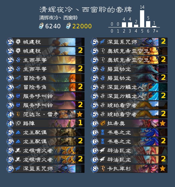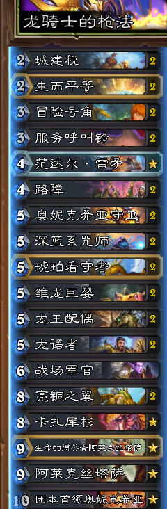 如果把职业龙牌都带上应该是这样的,但说实话这样的套牌太笨重了了,相比之前做过的大哥卡组,龙系列少突袭和优质嘲讽,虽然可以buff的很大却很难踢到脸,