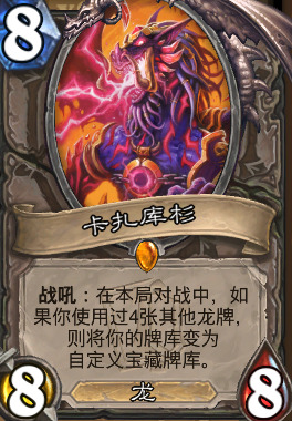 4.关于变卡扎库杉的时机,由于我把卡组改薄了,所以一般在牌库还有8-12张牌的时候,手牌就已经疲软了,这时候你就应该考虑变身了,变身的时候你最好手上留一张小蓝龙或者雏龙巨婴(如果你有带的话),变过身俩费抽张牌会非常舒服。