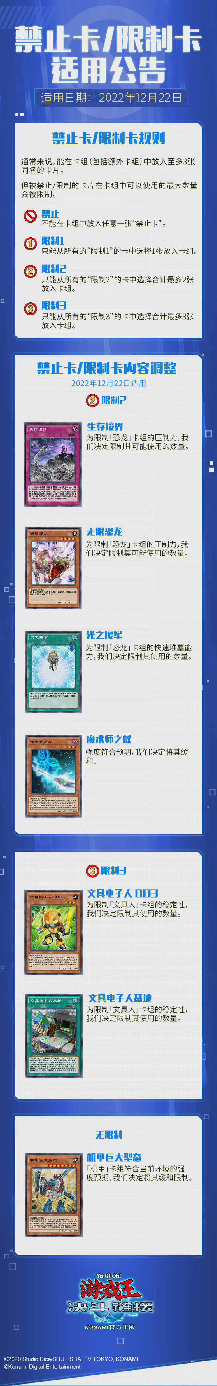 为了优化玩家的决斗体验,维护环境平衡,游戏内将视情况对禁止/限制卡内容做出调整。