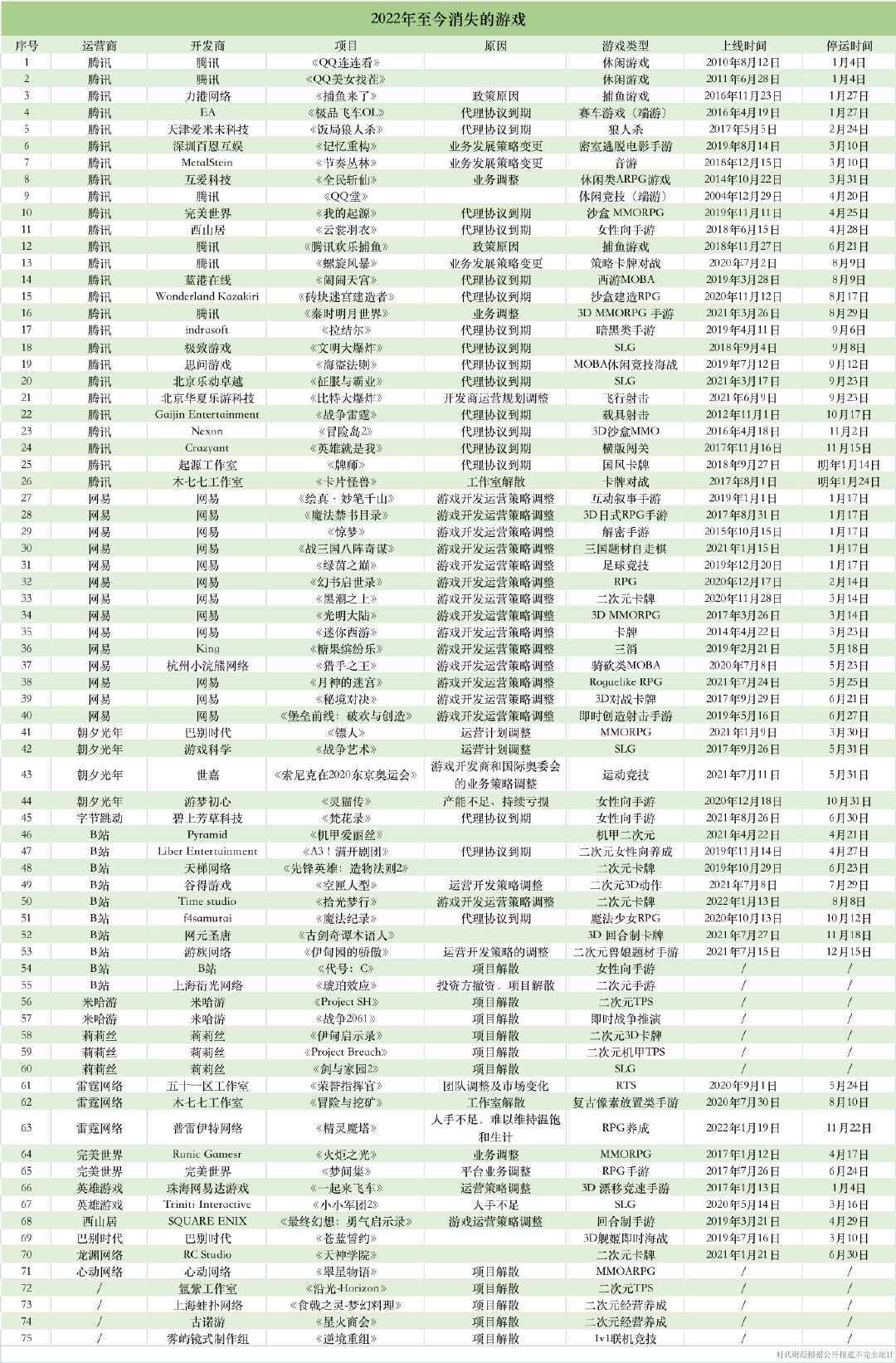 时代财经12月5日报道,根据公开报道统计,2022年内至少已有75款游戏项目宣布解散或停运。这些游戏大多由腾讯、网易、B站、朝夕光年等游戏大厂运营,其中不少游戏曾取得过极佳的成绩。但即便如此,也没能改变停运的结局,一纸公告已是它们最后的体面。