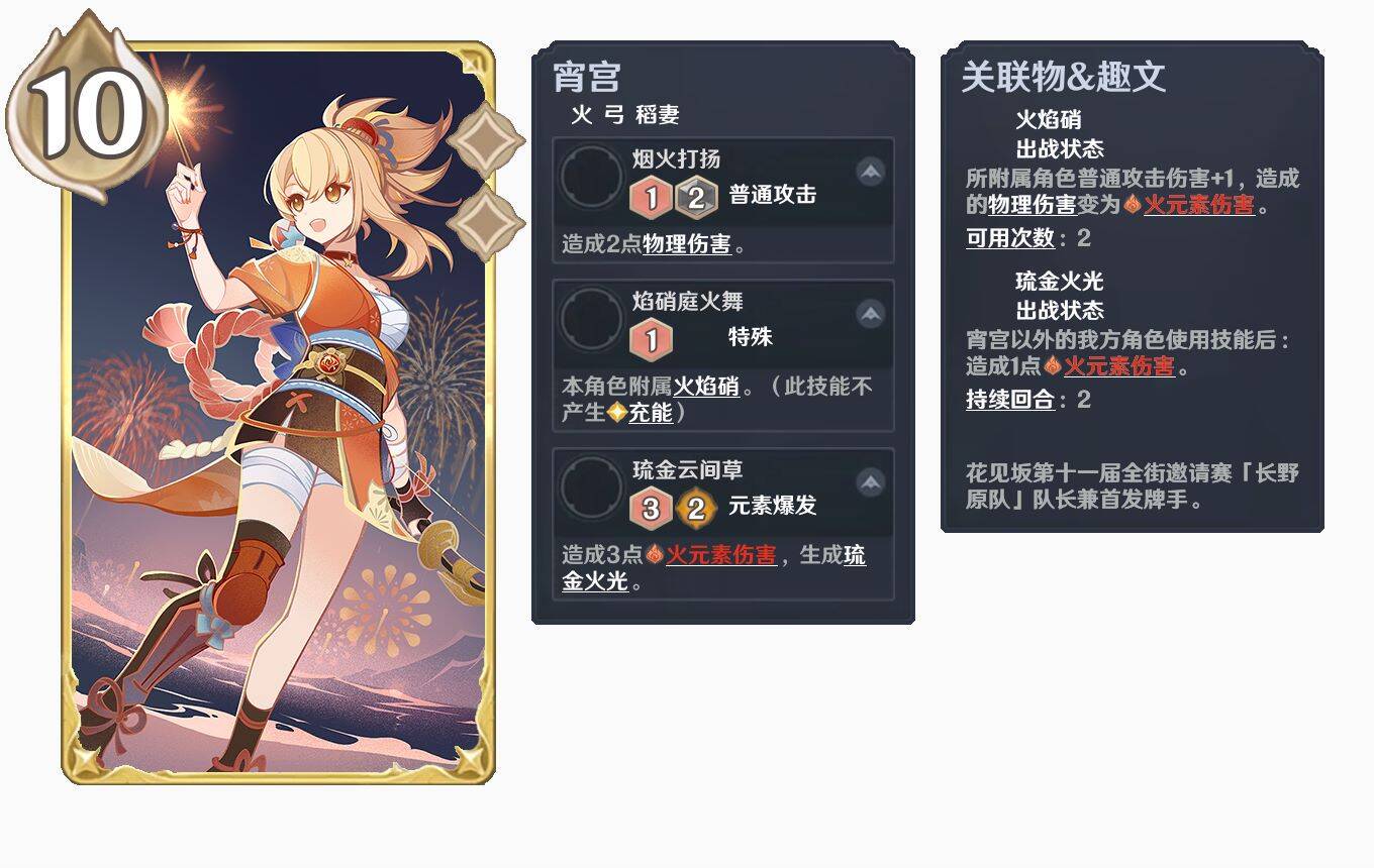 缺点:后续乏力,对操作和思考的能力要求较高,当然也并非完全不能打后期,我曾经在和双水女仆的大战中宵宫开出了3个大招,但是要打后期就对熟练度和理解要求比较高了,总结来说,这是一套易入门,难精通的卡组。
