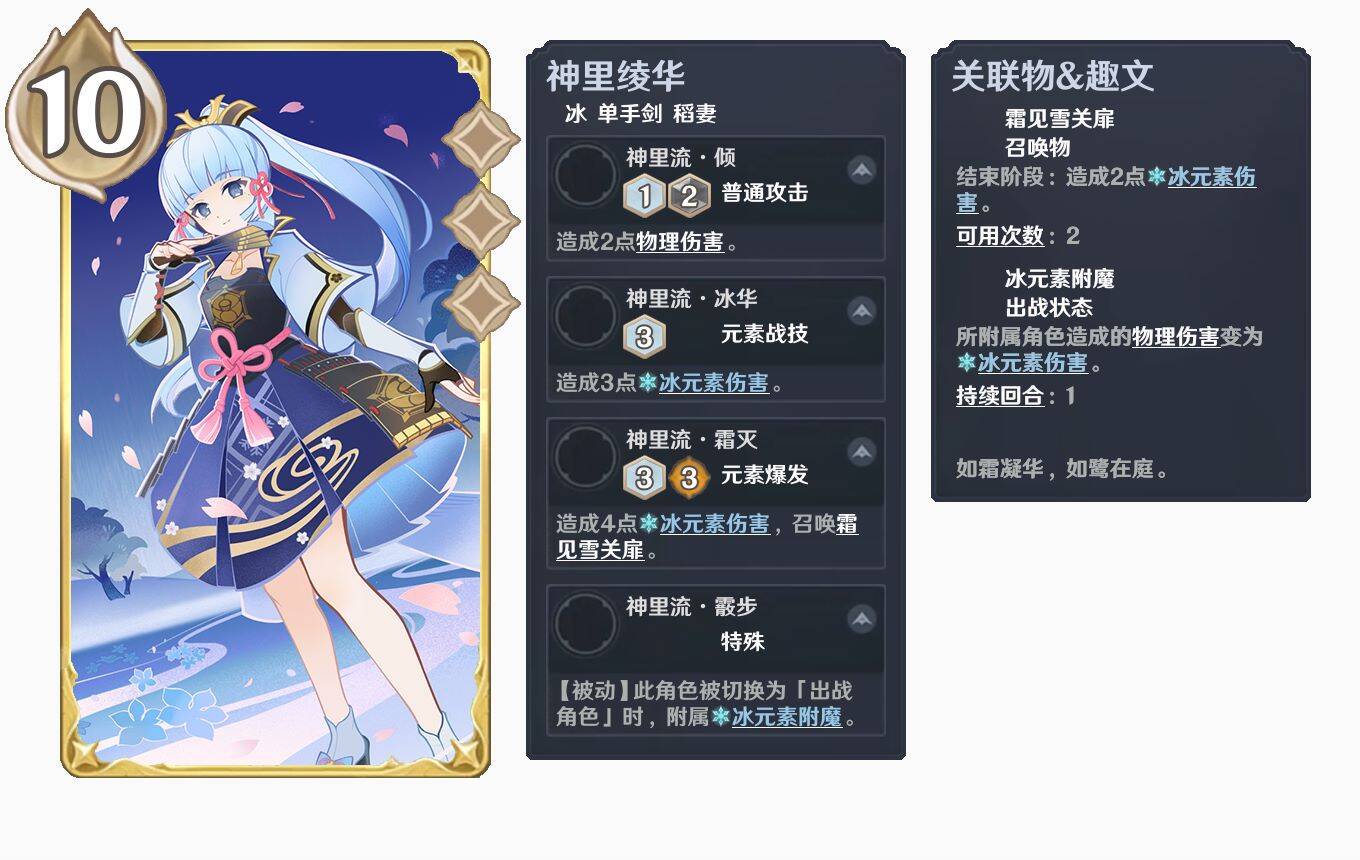 我们重点看的是被动效果,当绫华上场时,会为绫华冰元素附魔,持续一回合。