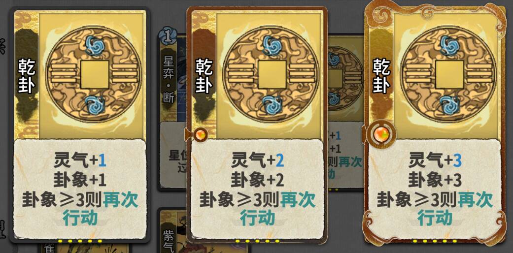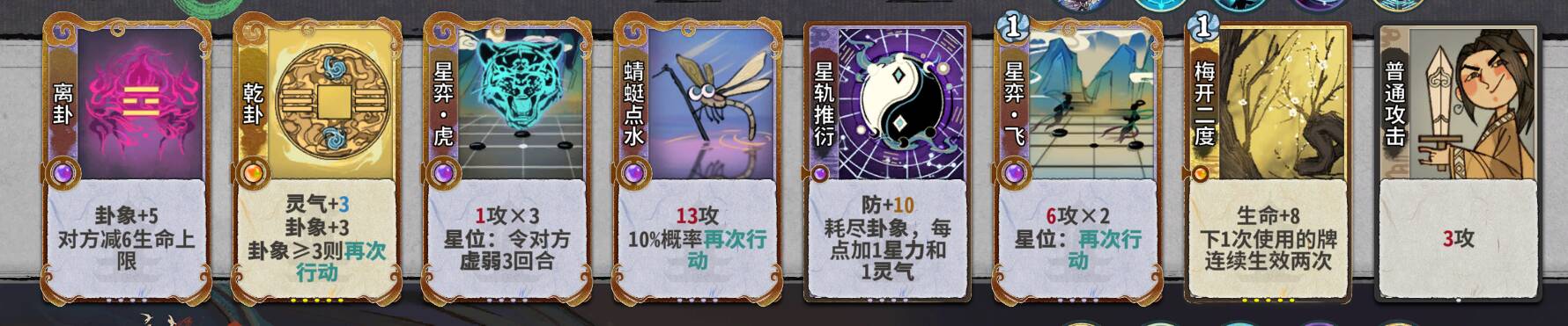 那么就说下这套卡组的关键思路:乾卦三级再平常的对局基本是抽不到的,所以要有一个离卦撑起卦象的数量。乾卦再动星奕虎虚弱,一般情况下星奕虎只有两级在七星定魂前一回合对面的虚弱解除,如果对面的爆发在这一回合可能会寄。三级的星奕虎就可以除了第一回合全覆盖虚弱狠恶心。然后就是蜻蜓点水再动,星轨推衍把多余的卦象转化为星力和灵气,这两张牌没有级别限制。星奕飞也是没有级别限制只是为了再动。梅开二度是触发两次七星定魂让对面二次无法行动。