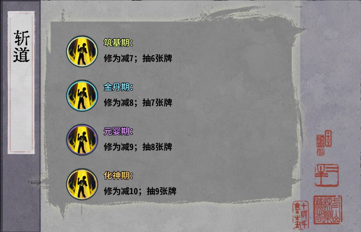 斩道只在元婴期的牌没拿全和想赌一手化神期的牌的时候才拿,但是比较亏修为。本来小明就没有额外加修为的手段,这个仙命酌情选择。(我个人十分喜欢选这个)