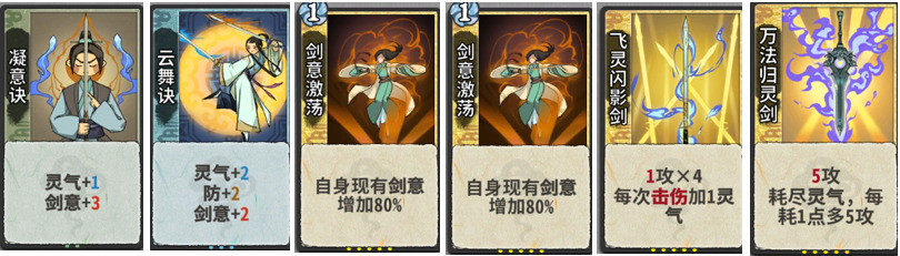 常规带卡就是若干加剑意的卡前置后接一张多段攻击,这里强烈推荐多段攻击的卡后期替换成飞灵闪影剑之后再接一张万法归灵剑,确保伤害的最大化。