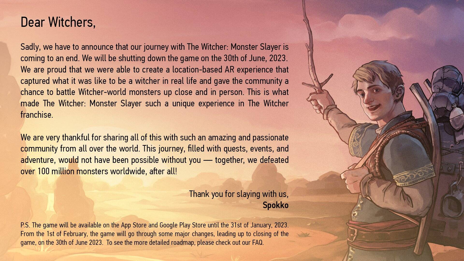 值得一提的是,在昆特牌发出大新闻的第二天(12月6日),CDPR的另一款AR手游“巫师:怪物杀手”发出了停服公告。