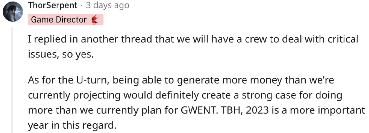 公告中表示将在1月31日下架应用商店,6月30日停服。换言之,CDPR确实有迅速结束一款游戏的能力。根据一些官方合作伙伴的透露,昆特项目组仍不想放弃游戏,做出决定的是CDPR高层,但在V哥据理力争下给了最后一线机会。舅舅也补充:如果昆特牌有如何计划上的改变,预计会在明年世界大师赛上公布,