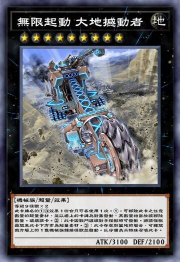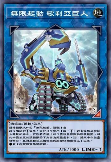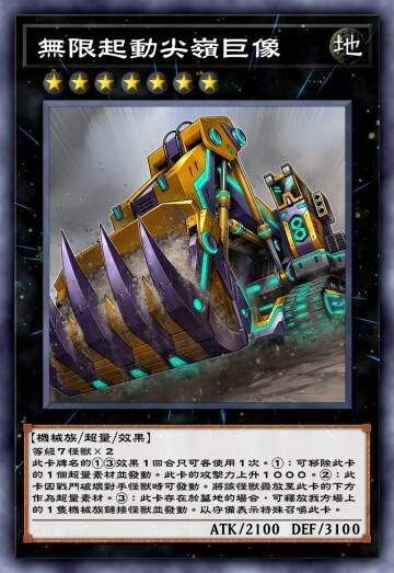 无限起动本家link1,效果就是专门为了本家超量怪兽设计的,先手可以考虑出后面提到的【无限起动尖岭巨像】然后连接召唤歌利亚巨人,然后cost歌利亚巨人,守备表示特召尖岭巨像把歌利亚巨人做垫子,这样先手就可以3100守备力站场且不会被效破。后手可以考虑叠R9的撼动者解场然后重复以上操作,2100守备力不被效破站场。