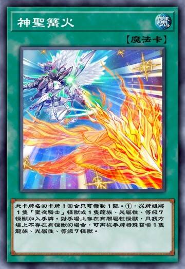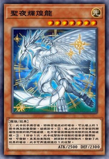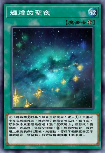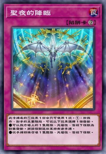 圣夜本家的另一个妥协检索手段,等同于用手牌的本家下级交换卡组的【圣夜辉煌龙】。②效果,二速响应对手魔陷怪兽效果的发动,可特召手牌中的【圣夜辉煌龙】。算是比较被动的回合外干扰。