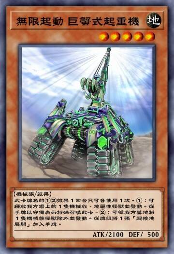 ①效果给我方机械族怪兽提供一个不会被取对象的抗性。②效果等同于无限起动本家升阶魔法,而且是永续的升阶魔法,一回合可以发动一次,最重要的一点,这张卡是可以用起重机检索的。