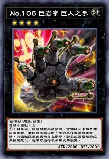 本次的封面怪兽,没有出乎大家的意料,是基拉古王牌怪兽No.106。泛用R4,二速单体怪兽效果封锁,诱发效果,双2000的攻守数值注定了它的平庸,不管是先手还是后手出场都差点意思,但是至少可用。