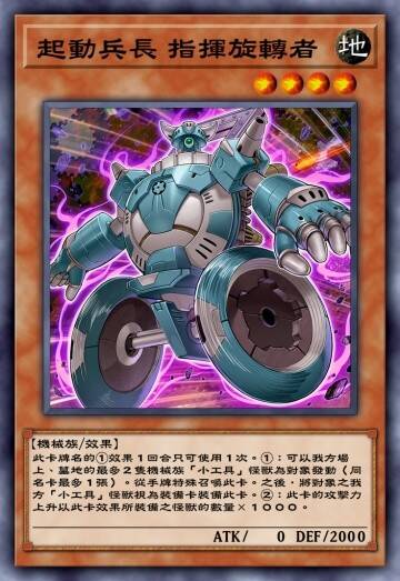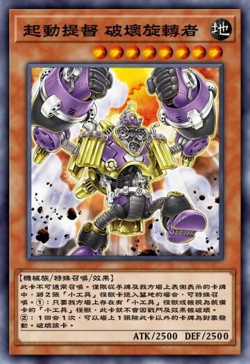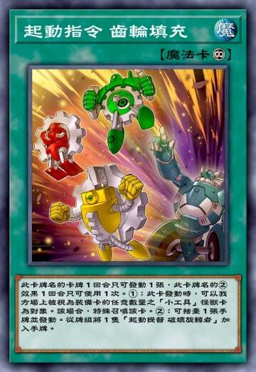 小工具本家大终端,①效果是一个战破+效破抗性,但是需要有小工具怪兽在场或者视为装备卡的小工具怪兽;②效果,一回合一次,取对象炸1卡。没有抗性的话,双2500的攻守数值对手还是不难处理的。不过好在这卡出场简单,而且可以被下面的【起动指令 齿轮填充】检索。