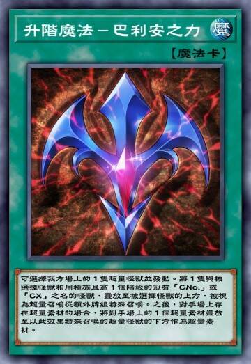 巴利安之力!!!!!在超量召唤登陆DL两年后,K社终于舍得放出升阶魔法了!!!不过目前能出的【CNO.】(混沌编号)和【CX】(混沌超量)的怪兽还是极少的,所以这张卡发挥的空间不大。期待后续补强。