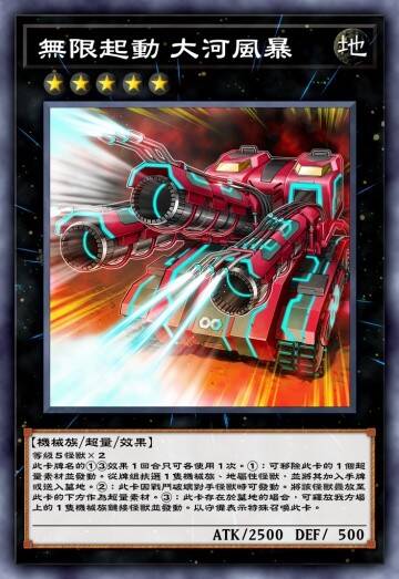大河风暴这卡仔细一看,不就是无限起动本家检索魔法【起送机回送】卡图上的吗?难怪效果也基本一样,不过除了检索还可以堆墓,更加灵活了,而且作为一个泛用R5,2500的攻击力很不错。