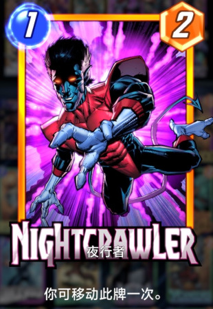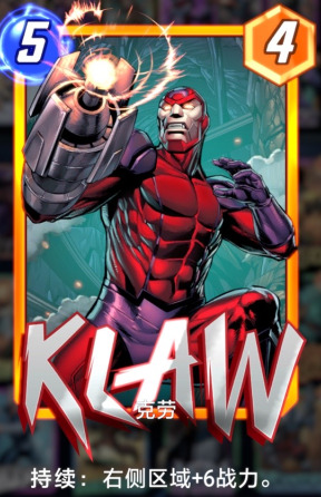 所以这张牌不要和你的其他牌扎堆,尽量单人吃单路,他是一张注定要躲开对手密集区走单线的卡牌。而克劳,蓝惊奇,夜魔,神奇先生,松鼠女,艾丽卡都可以在最后的时刻让对手盘算满满的这条路突然失控。