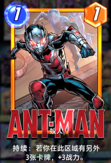 缓解卡手卡费的填费卡,特别是这套牌4费完全放空,很多时候是要依赖这张牌去填4费场面的。没有什么特别要说的功能,大多数时候的作用是给蚁人所在或者准备在的左路或右路填坑,顺便吃一吃蓝惊奇的buff。