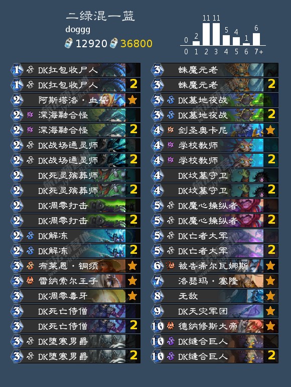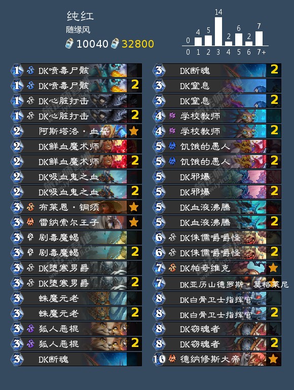 这个机制导致的直接原因就是,我遇到的感觉上比较厉害的DK卡组,要么是Luna那种构筑的比较好的纯蓝卡组,要么就是拉满各种发现,我以随缘风和之前dog死亡骑士职业试玩时候的卡组做例子。