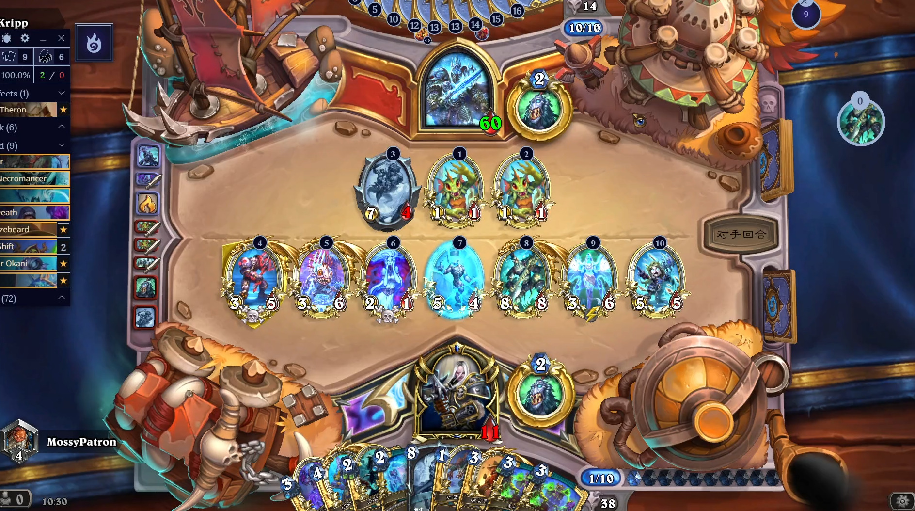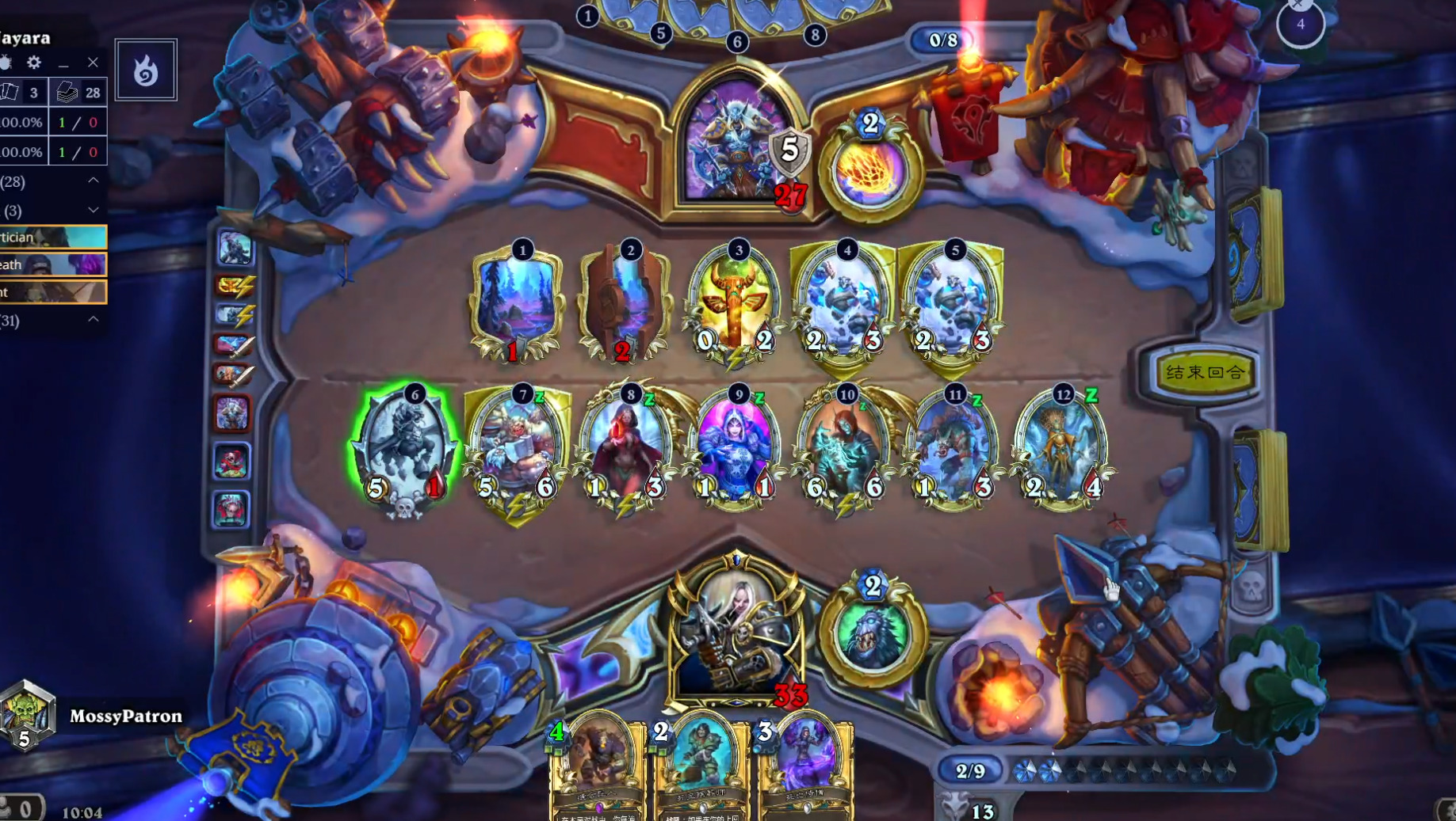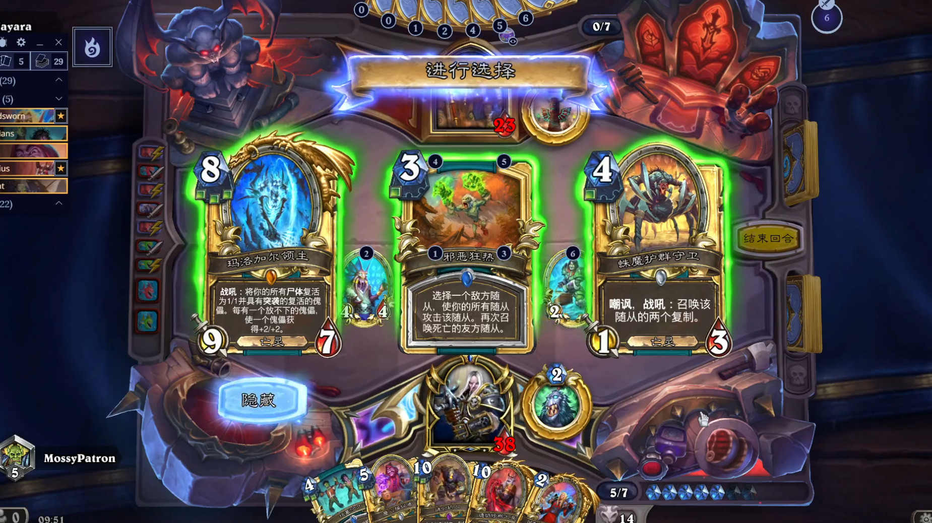 先看一些实战截图,这张天灾军团的强度非常高。召唤的生物实际上大概值20-25费,得益于DK特殊的发现机制,这张牌经常出现在我的发现选项里,大家可以类比之前奶骑,石丘守护者,佛丁三者的关系,佛丁非常超模很多对局都有爆炸的效果但因为可以发现,就可以不带这种高费用的牌,经弹幕提醒,我才发现这张法术本身还是暗影可以配合可能召唤出来的塔姆辛。算是一个后期的终结点,极大的提升了DK发现池的质量。
