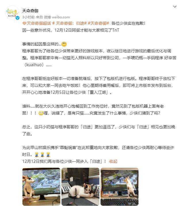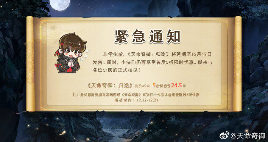 天命奇御官方微博更新动态,表示《 天命奇御:归途》将延期至12月12日发售。