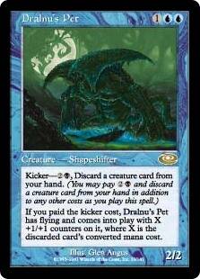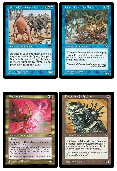 Escaped Shapeshifter可以複製其他生物的常青关键字异能。Dracoplasm是我第一次尝试将两个生物合併在一起。当时的规则无法处理太多複杂的东西,所以它只是将它们的攻防加起来而已。原版的设计比较像Unstable的Grusilda, Monster Masher或是依克黎:巨兽时空的合变机制。这想法有点领先时代。Flowstone Sculpture是个可以随时间变更和适应的生物,不过每次的改变都是永久的。